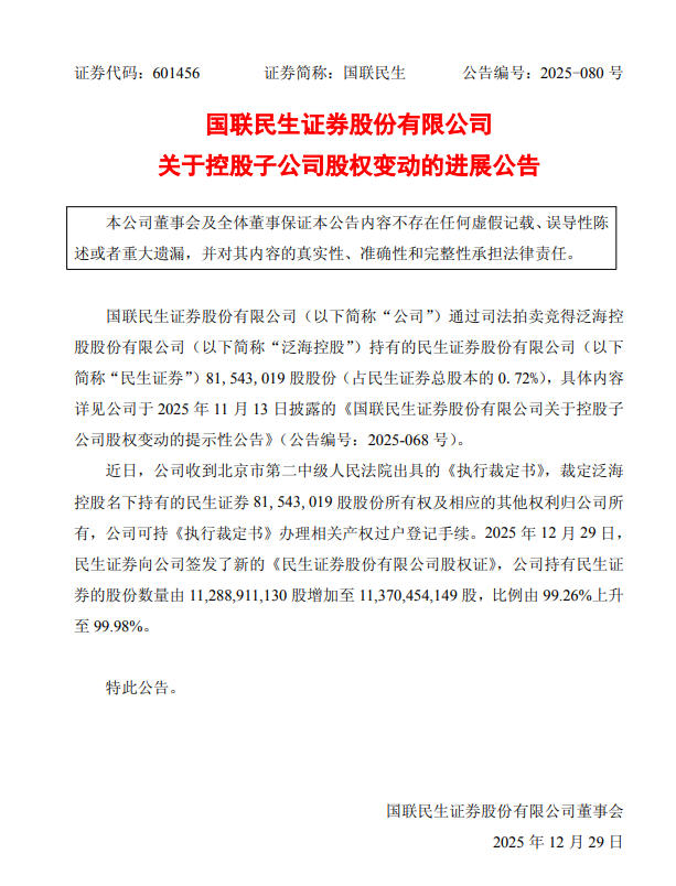 近日,国联民生证券收到北京市第二中级人民法院出具的《执行裁定书》,裁定泛海控股名下持有的民生证券8154.3万股股份所有权及相应的其他权利归国联民生证券所有,国联民生证券可持《执行裁定书》办理相关产权过户登记手续。2025年12月29日,民生证券向国联民生证券签发了新的《民生证券股份有限公司股权证》,国联民生证券持有民生证券的股份数量由112.89亿股增加至113.7亿股,比例由99.26%上升至99.98%。
