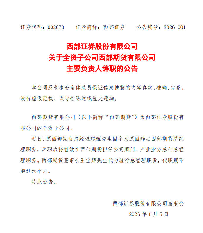 1月5日,西部证券股份有限公司(002673.SZ,下称“西部证券”)发布公告称,全资子公司西部期货有限公司(下称“西部期货”)总经理赵耀因个人原因辞职。公告显示,赵耀辞职后,将继续在西部期货担任公司顾问及产业业务总部总经理职务。西部期货董事长王宝辉代为履行总经理职责,代职期不超过6个月。