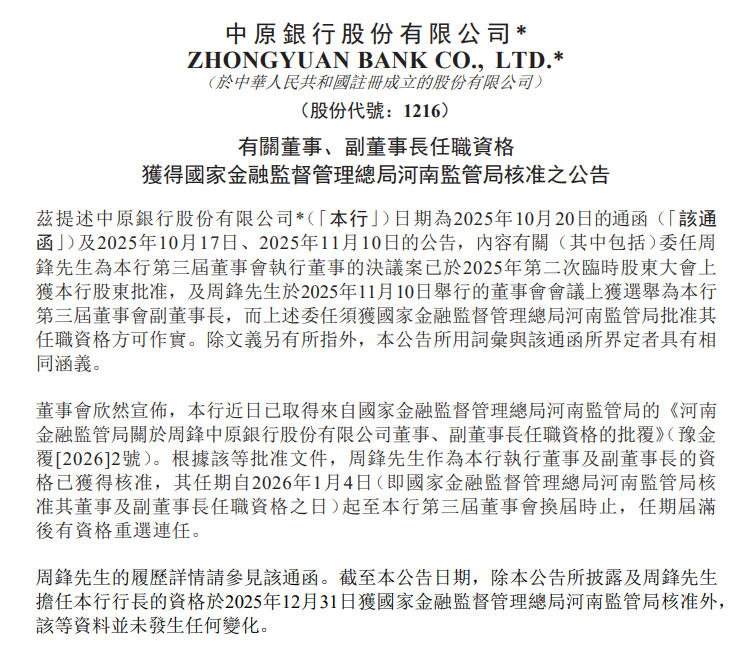 1月7日,中原银行股份有限公司(01216.HK,下称“中原银行”)发布公告称,近日已取得国家金融监督管理总局河南监管局的《河南金融监管局关于周锋中原银行股份有限公司董事、副董事长任职资格的批复》。根据该批准文件,周锋作为中原银行执行董事及副董事长的资格已获得核准,其任期自2026年1月4日起至该行第三届董事会换届时止,任期届满后有资格重选连任。