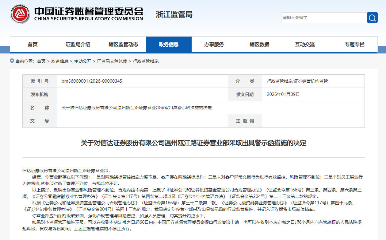 1月9日,浙江证监局发布公告称,经查,信达证券股份有限公司(601059.SH,下称“信达证券”)温州瓯江路证券营业部存在对两融绕标管控措施力度不足,客户存在两融绕标操作;未对客户异常交易行为进行有效监控,风险管理不到位;个别员工展业行为未留痕,营业部对员工管理不到位、合规监控不足的问题。
