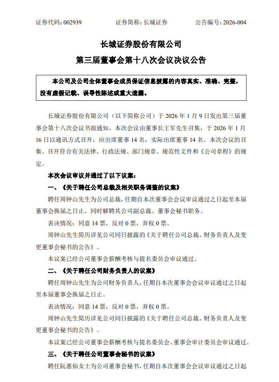 长城证券董事会聘任周钟山为总裁、财务负责人,解聘其副总裁、董事会秘书职务。同时,聘任阮惠仙为董事会秘书,将按照《证券法》及相关监管要求为阮惠仙办理证券公司高级管理人员任职备案手续。两人任期均自本次董事会会议审议通过之日起至本届董事会换届之日止。