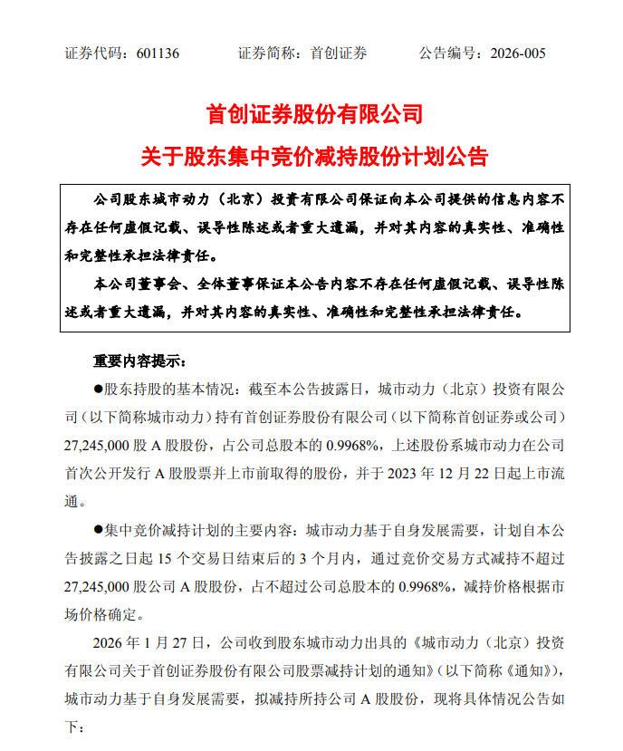 1月27日,首创证券股份有限公司(601136.SH,下称“首创证券”)发布关于股东集中竞价减持股份计划公告称,股东城市动力(北京)投资有限公司(下称“城市动力”)基于自身发展需要,拟减持所持首创证券A股股份不超过2724.50万股,计划减持比例不超过总股本的0.9968%。减持期为2026年2月27日—5月27日。