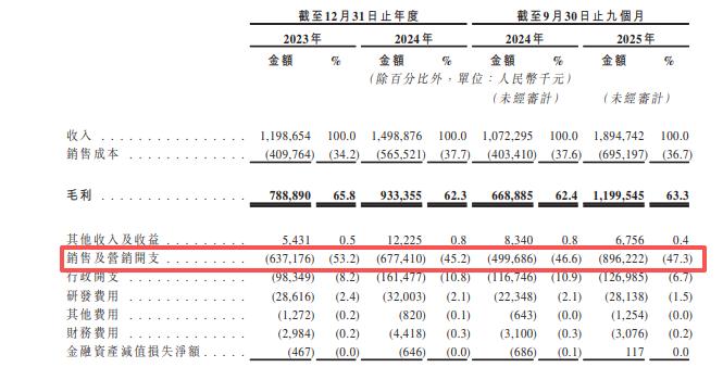 从招股书来看,花物堂的增长极度依赖营销驱动。2023-2024年以及2025年前三季度,该公司的销售及营销开支分别为6.37亿元、6.77亿元和8.96亿元,占收入比例始终在45%以上,最高达53.2%。