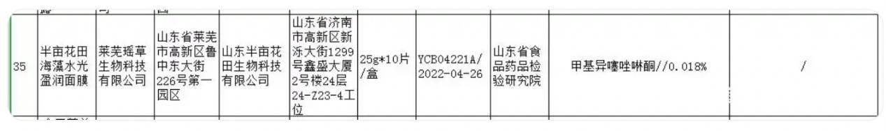 2020年9月,山东药监局曾通报,花物堂旗下品牌“半亩花田”的一批次“海藻水光盈润面膜”被检出防腐剂“甲基异噻唑啉酮”超标1.8倍。被山东药监局没收相关产品和违法所得,并处罚款3万余元,罚没款合计39461.1元。