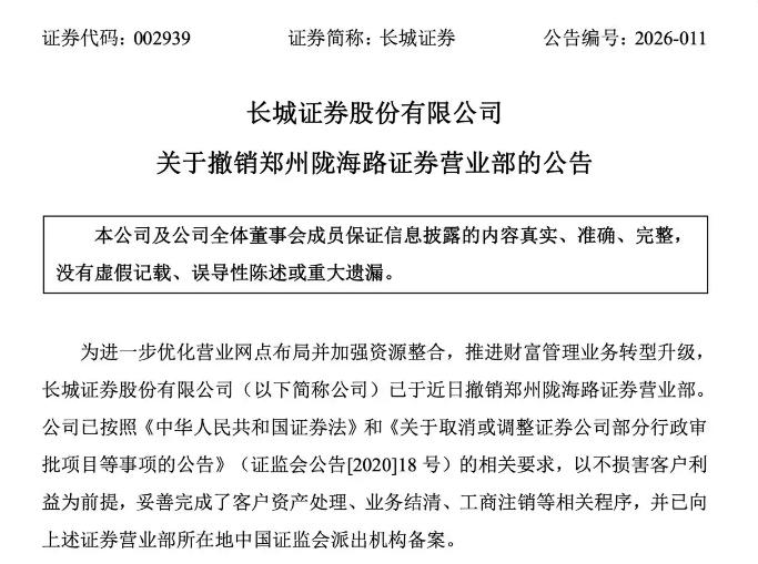 2月2日,长城证券股份有限公司(002939.SZ,下称“长城证券”)发布公告称,为进一步优化营业网点布局并加强资源整合,推进财富管理业务转型升级,已于近日撤销郑州陇海路证券营业部,并已向上述证券营业部所在地中国证监会派出机构备案。