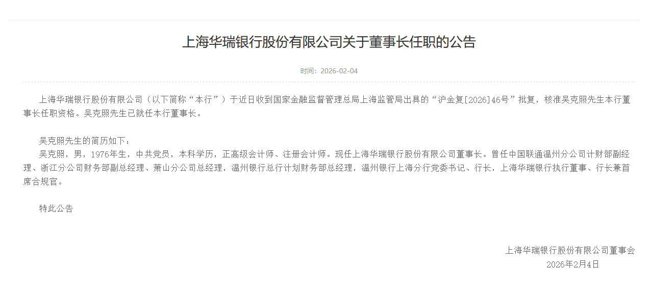 2月4日,上海华瑞银行股份有限公司(下称“上海华瑞银行”)发布公告称,近日收到国家金融监督管理总局上海监管局出具的“沪金复[2026]46号”批复,核准吴克照该行董事长的任职资格。吴克照已就任上海华瑞银行董事长。