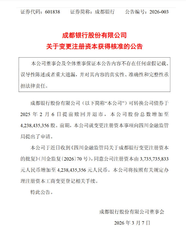 3月6日,成都银行股份有限公司(601838.SH,下称“成都银行”)发布公告称,该行可转换公司债券于2025年2月6日提前赎回并退市,该行股份总数增加至42.38亿股。前期,该行就变更注册资本事项向四川金融监管局提出了申请。该行于近日收到《四川金融监管局关于成都银行变更注册资本的批复》,同意公司注册资本由37.36亿元增加至42.38亿元。成都银行表示,将按照有关规定办理注册资本工商变更登记相关手续。