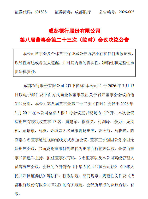 3月20日,成都银行股份有限公司(601838.SH,下称“成都银行”)发布第八届董事会第二十三次(临时)会议决议公告称,会议审议通过了《关于聘任成都银行股份有限公司副行长的议案》,同意聘任齐姣姣、周志晨为该行副行长,任期至第八届董事会届满为止。齐姣姣、周志晨任职资格尚待国务院银行业监督管理机构核准。