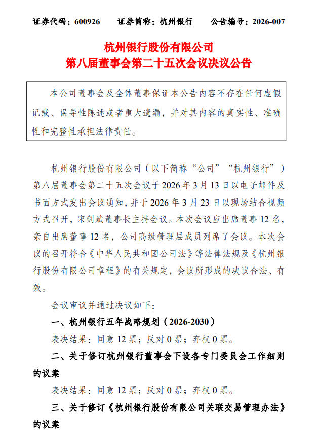 3月23日,杭州银行股份有限公司(600926.SH,下称“杭州银行”)发布公告称,该行第八届董事会第二十五次会议审议并通过《关于聘任杭州银行首席合规官的议案》,同意聘任王立雄为该行首席合规官,任期至第八届董事会届满之日止。王立雄任杭州银行首席合规官的任职资格尚待国家金融监督管理总局浙江监管局核准。