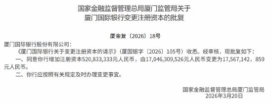 3月24日,国家金融监督管理总局厦门监管局发布《关于厦门国际银行变更注册资本的批复》,同意厦门国际银行增加注册资本约5.21亿元,由约170.46亿元变更为约175.67亿元。