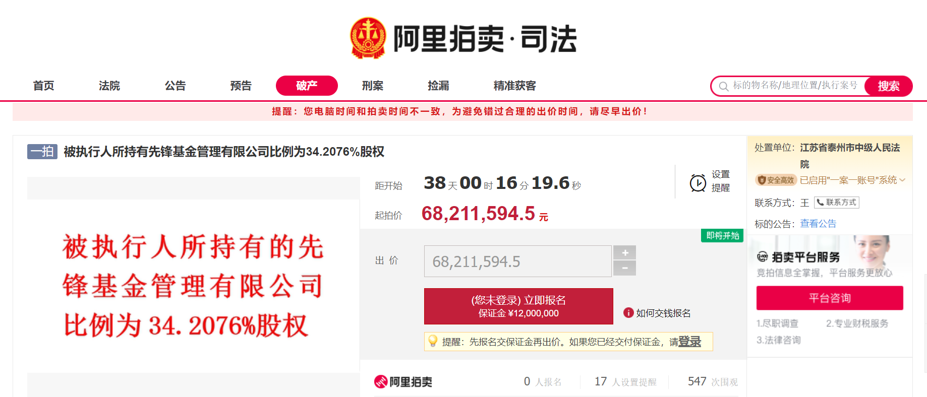 近日,阿里拍卖平台显示,先锋基金34.21%的股权将于2022年2月14日进行拍卖,这部分股权曾在2020年4月公告进行拍卖,但后来又被撤回。