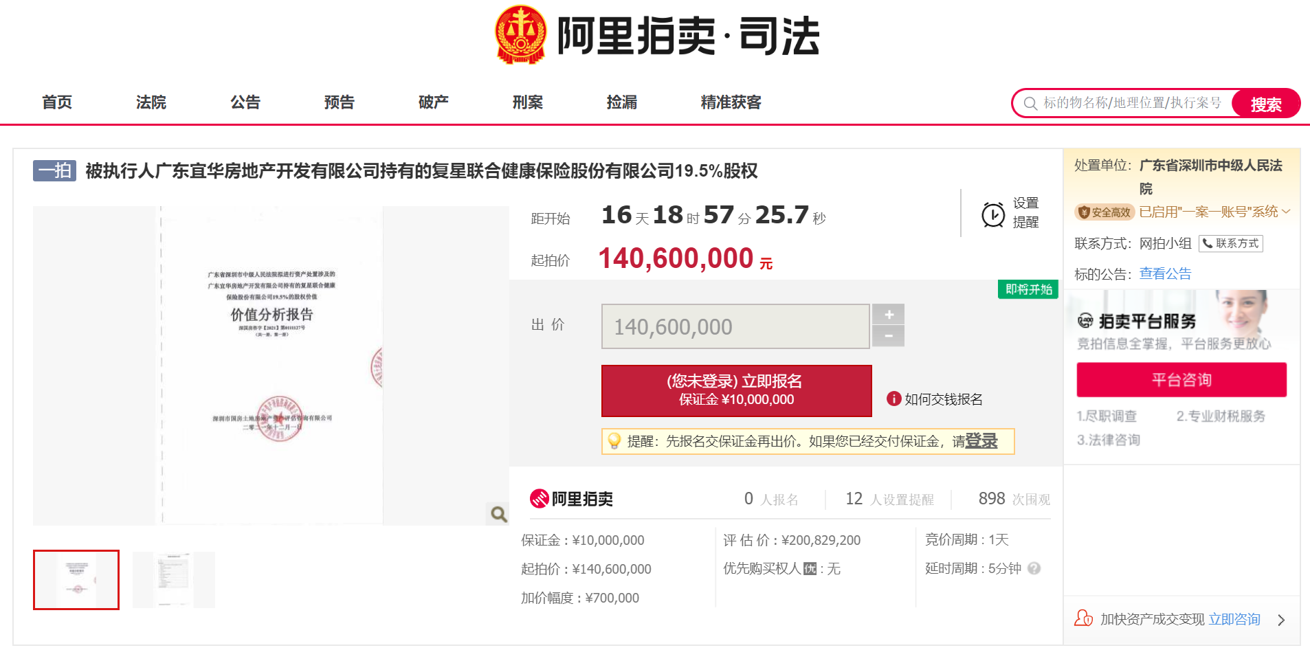 据阿里拍卖网,被执行人广东宜华房地产开发有限公司持有的复星联合健康保险股份有限公司(下称“复星联合健康”)19.5%股权将被拍卖,起拍价为1.41亿元,评估价为2.01亿元,拍卖开始时间为2022年1月28日10时至2022年1月29日10时。