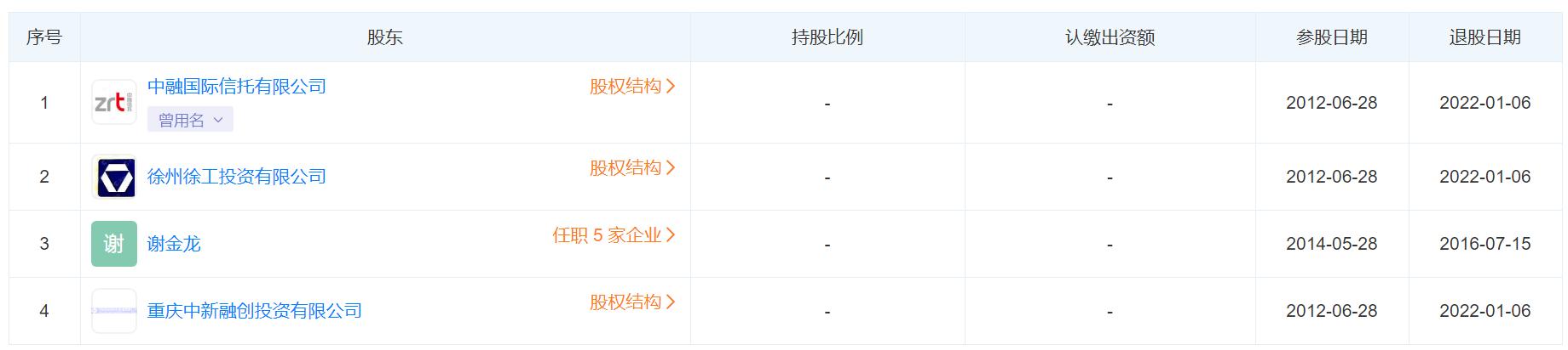 据天眼查App,1月6日,中融国际信托有限公司(下称“中融信托”)退出对重庆昊融睿工投资中心(下称“昊融睿工”)的持股,退出前持股为53.26%。