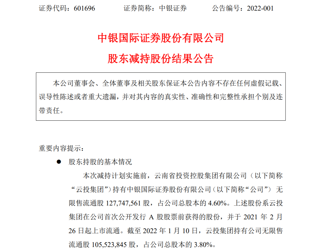 公开资料显示,此次减持计划实施前,云投集团持有中银证券无限售流通股1.28亿股,占中银证券总股本的 4.60%。截至2022年1月10日,云投集团持有中银证券无限售流通股1.06亿股,占中银证券总股本的3.80%。