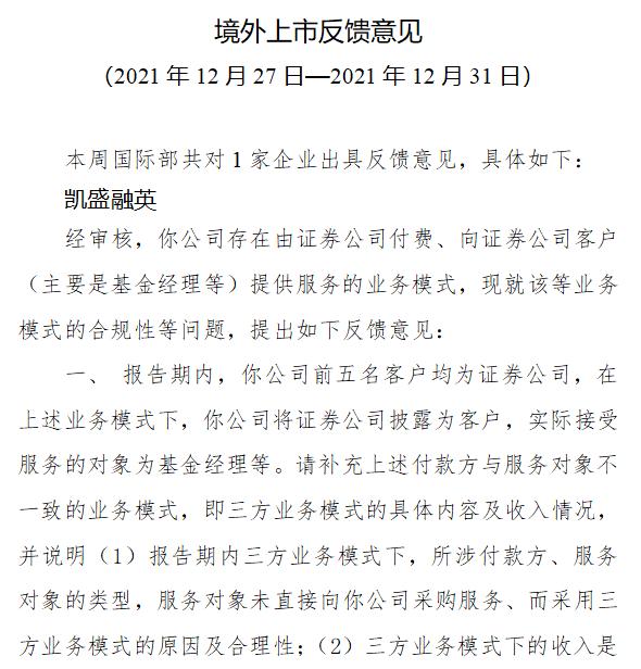 2021年12月31日,中国证监会官网披露了对凯盛融英信息科技(上海)股份有限公司(下称“凯盛融英”)境外上市书面反馈意见。