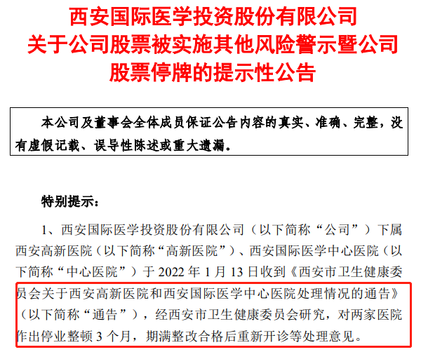 1月13日午间,西安市卫生健康委员会发布通告称,国际医学(000516.SZ)旗下西安高新医院(下称“高新医院”)与西安国际医学中心医院(下称“中心医院”)因机械地执行相关防疫政策,延误急危患者抢救和诊治,引发社会舆论广泛关注,造成严重后果,决定对上述医院做出停业整顿3个月的处罚措施,并追究相关责任人。