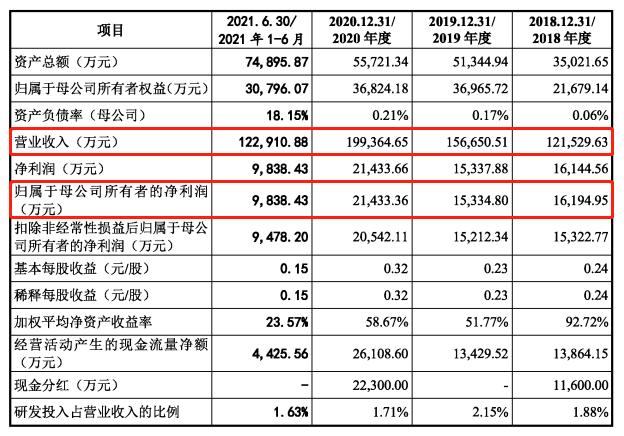 2018-2020年及2021年上半年,三态股份的营业收入分别为12.15亿元、15.67亿元、19.94亿元、12.29亿元,归母净利润分别为1.62亿元、1.53亿元、2.14亿元、0.98亿元。