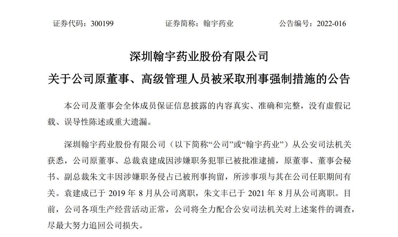 1月25日,翰宇药业(300199.SZ)发布公告称,从公安司法机关获悉,原董事、总裁袁建成因涉嫌职务犯罪已被批准逮捕,原董事、董事会秘书、副总裁朱文丰因涉嫌职务侵占已被刑事拘留,所涉事项与其在任职期间有关。