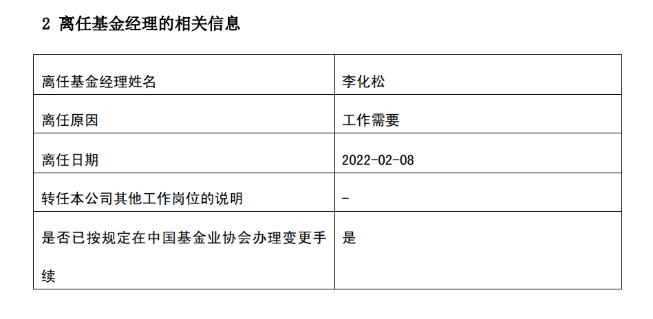 2022年2月9日,平安基金发布公告称,李化松因工作需要于2022年2月8日离任平安低碳经济混合、平安匠心优选混合2只基金。离任后,平安低碳经济混合由何杰独立管理,平安匠心优选混合由张淼独立管理。