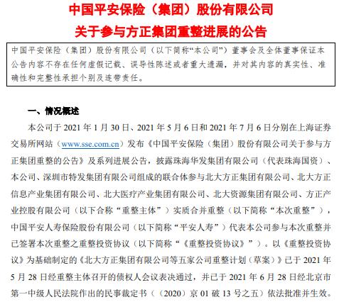 中国平安公告显示,该公司与珠海华发集团有限公司(代表珠海国资)、深圳市特发集团有限公司组成的联合体参与了此次重整计划。