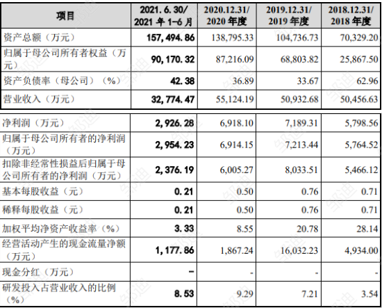 2020年,龙华薄膜的净利润有所下滑。2018年至2021年上半年,龙华薄膜营业收入分别为5.05亿元、5.09亿元、5.51亿元、3.28亿元,归母净利润分别为0.58亿元、0.72亿元、0.69亿元、0.30亿元。