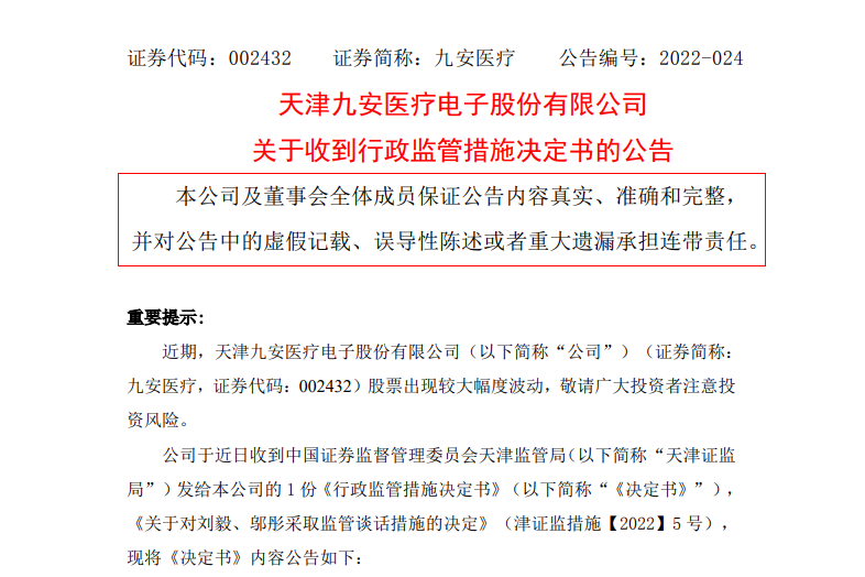 天津证监局表示,刘毅作为九安医疗董事长、总经理,邬彤作为九安医疗董事会秘书,对临时报告信息披露的完整性承担主要责任。依据相关规定,天津证监局决定对刘毅、邬彤采取监管谈话的监督管理措施。