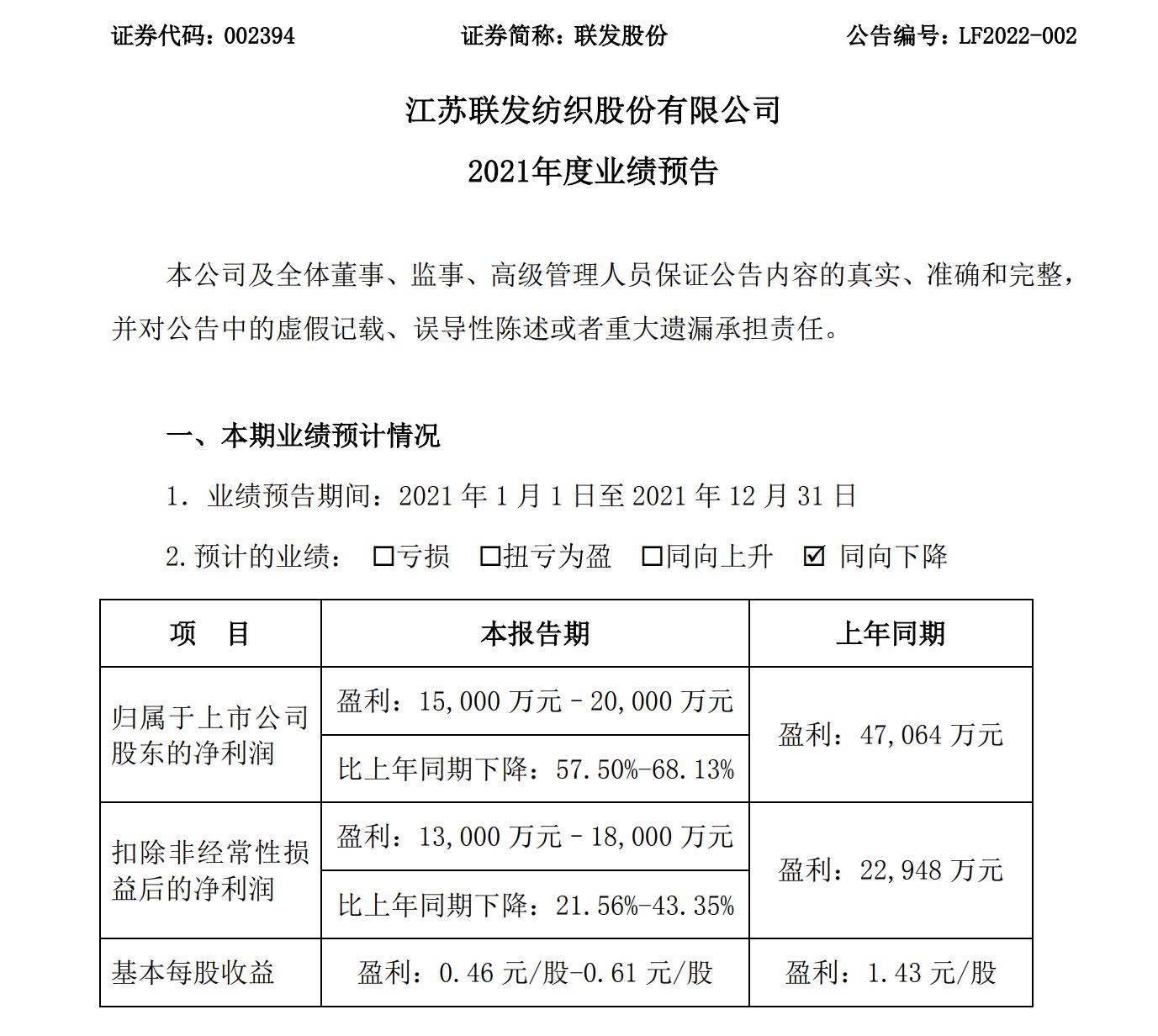 1月26日,联发股份(002394.SZ)发布业绩预告称,2021年预计实现净利润1.50亿元至2.00亿元,同比下降57.50%-68.13%;预计实现扣非净利润1.30亿元至1.80亿元,同比下降21.56%-43.35%。