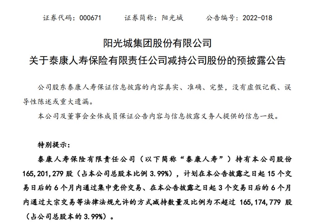 2月10日,阳光城(000671.SZ)发布公告称,泰康人寿保险有限责任公司(下称“泰康人寿”)持有阳光城1.65亿股(占总股本比例的3.99%)股份,计划在2月10日起15个交易日后的6个月内减持数量及比例为不超过1.65亿股(占总股本的3.99%)。