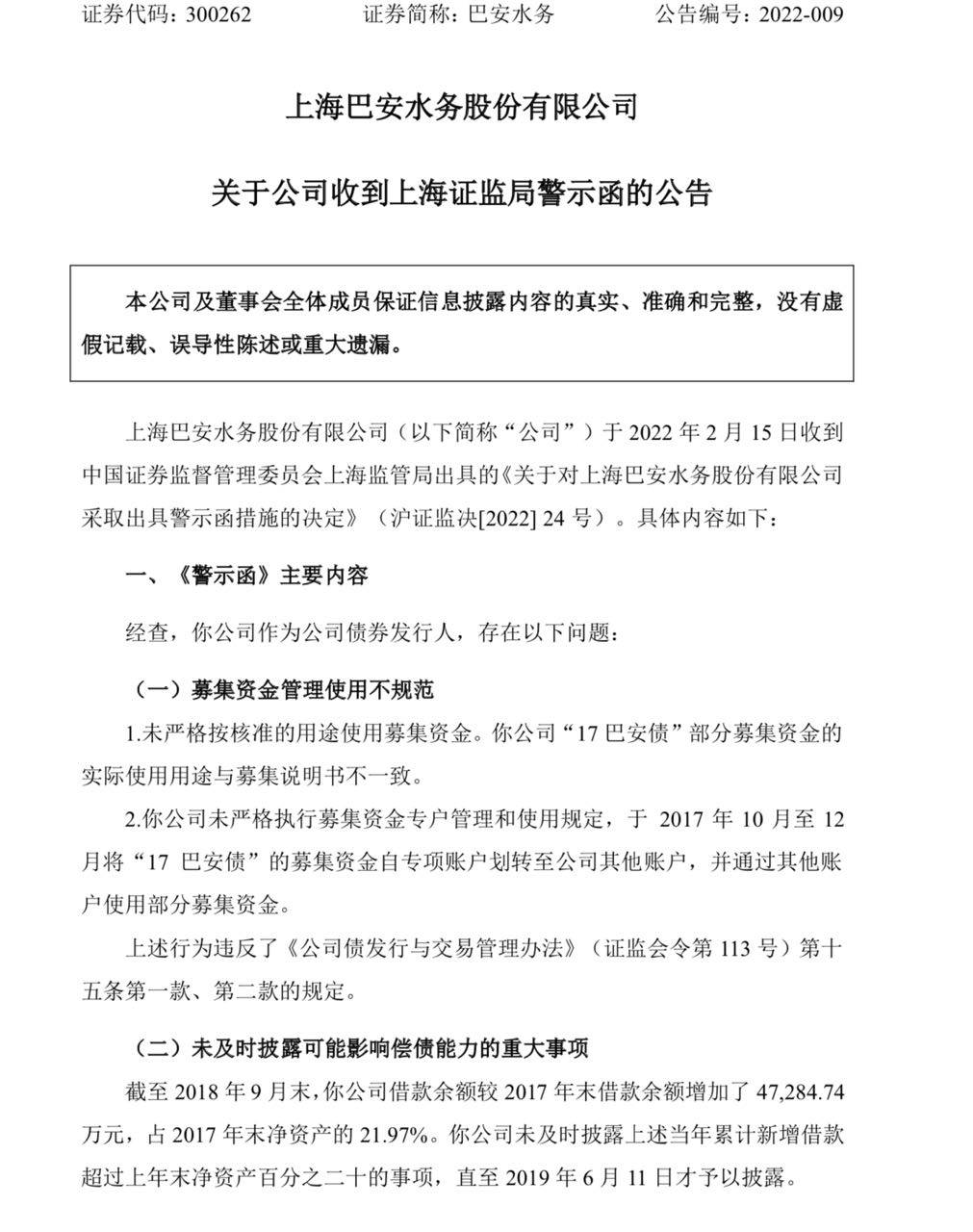 2月15日,巴安水务(300262.SZ)发布公告称,因未及时披露重大事项,收到上海证监局警示函。