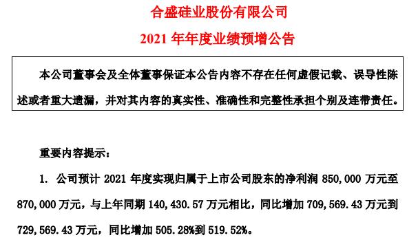 1月11日晚间,合盛硅业(603260.SH)发布2021年业绩预盈公告称,预计实现净利润85亿—87亿元,同比增长505.28%—519.52%。