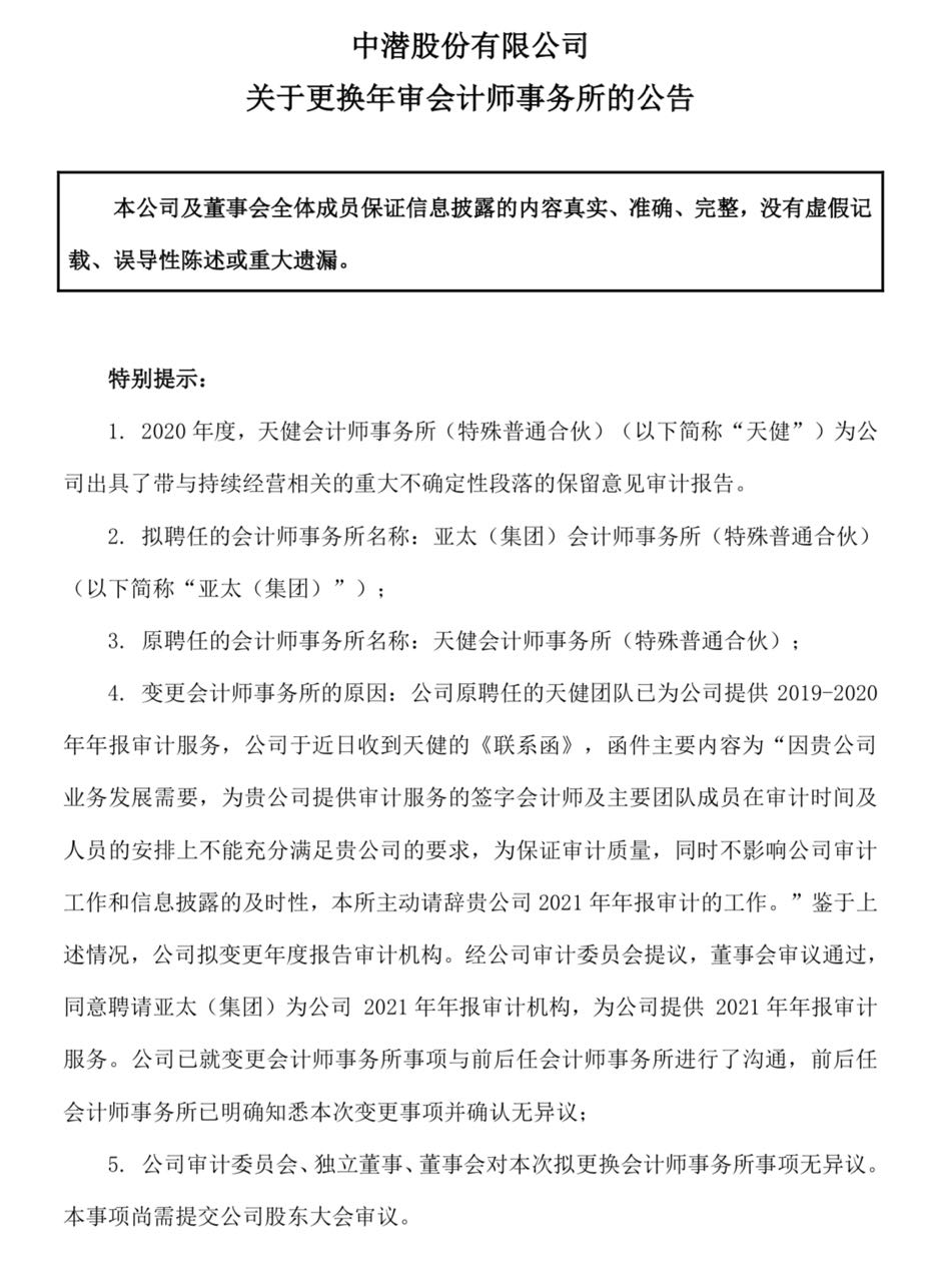 2月17日,中潜股份披露关于更换年审会计师事务所的公告称,中潜股份收到天健所主动请辞该公司2021年年报审计工作的《联系函》。