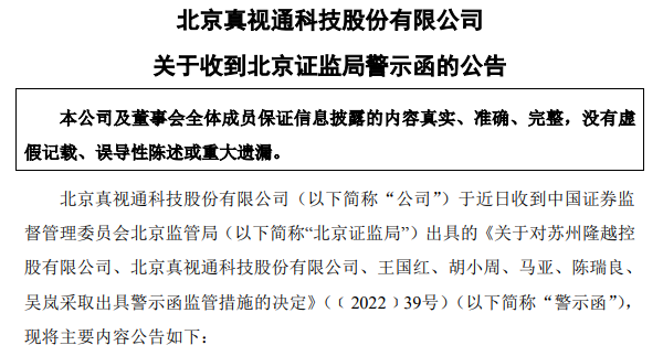 公告显示,2019年8月30日,苏州隆越受让真视通原控股股东之一、时任董事长胡小周,原控股股东之一、时任总经理王国红,股东、时任董事会秘书吴岚,股东、董事马亚和股东、时任董事陈瑞良所持有的11.78%股份,在此之前,上述股东曾向苏州隆越出具关于真视通在2019—2021年期间营业收入、净利润等方面的《承诺函》。截至2021年8月19日,真视通才披露《承诺函》的相关内容,此举严重违反了《上市公司信息披露管理办法》相关规定。