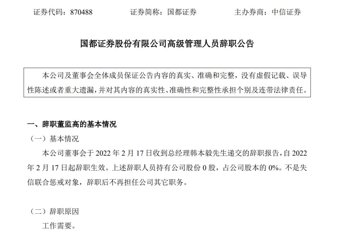 2月20日,国都证券(870488.OC)发布公告称,韩本毅因工作需要辞去该公司总经理一职。