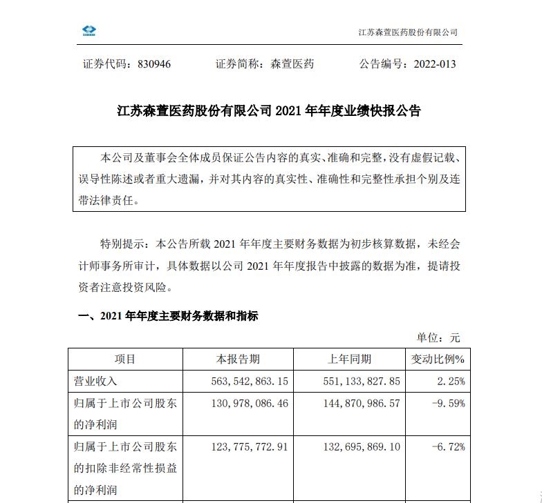 2月23日,森萱医药(830946.BJ)发布业绩快报称,2021年实现营业收入5.64亿元,同比增2.25%;实现净利润1.31亿元,同比降9.59%。