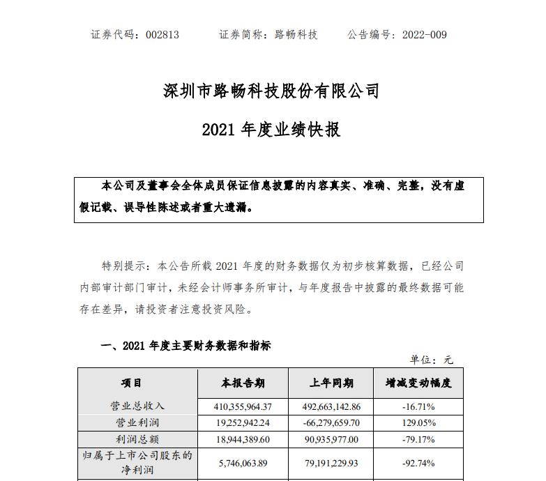 2月24日,路畅科技(002813.SZ)发布业绩快报称,2021年实现营业收入4.10亿元,同比下降16.71%;实现净利润574.61万元,同比下降92.74%。