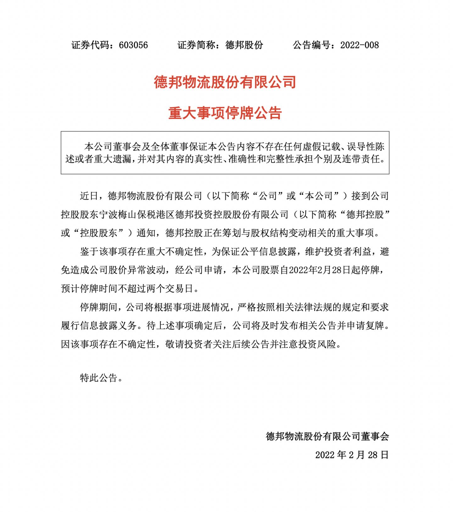 2月27日,德邦股份(603056.SH)发布公告称,近日接到控股股东宁波梅山保税港区德邦投资控股股份有限公司通知,德邦控股正在筹划与股权结构变动相关的重大事项。鉴于该事项存在重大不确定性,为保证公平信息披露,维护投资者利益,避免造成股价异常波动,自2022年2月28日起停牌,预计停牌时间不超过两个交易日。