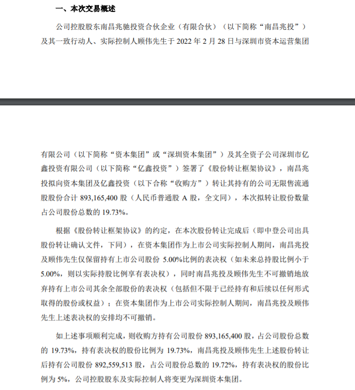 2月28日,停牌一周的兆驰股份(002429.SZ)发布关于控股股东和实控人拟发生变更的提示性公告。公告称,2月28日,该公司控股股东南昌兆投及其一致行动人、实控人顾伟,与深圳资本集团及其全资子公司亿鑫投资签署《股份转让框架协议》,南昌兆投拟以每股4.89元,合计43.66亿元的价格,向深圳资本集团及亿鑫投资转让其持有的合计8.93亿股无限售流通股股份,占上市公司股份总数的19.73%。