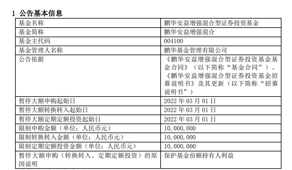 2022年2月28日,鹏华基金发布公告称,鹏华安益增强混合(004100)3月1日起暂停大额申购。