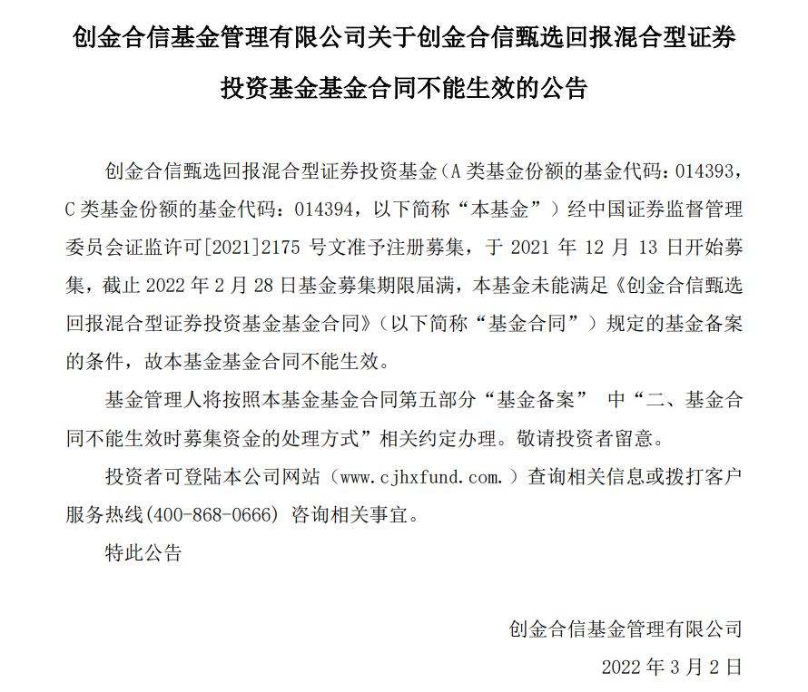 2022年3月2日,创金合信基金发布公告称,旗下产品创金合信甄选回报混合型证券投资基金于2021年12月13日开始募集,截止到2022年2月28日基金募集期限届满,未能满足合同规定的基金备案的条件,故基金合同不能生效。