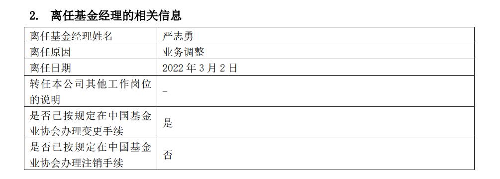 2022年3月2日,西部利得基金发布公告称,严志勇因业务调整离任西部利得聚享一年定开债券(A类007377/C类007378)、西部利得聚利6个月定开债券(A类007375/C类007376)。
