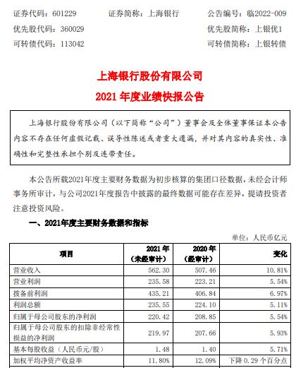 公告显示,上海银行2021年利润总额为235.55亿元,同比增5.11%;基本每股收益为1.48元/股,同比增5.71%。