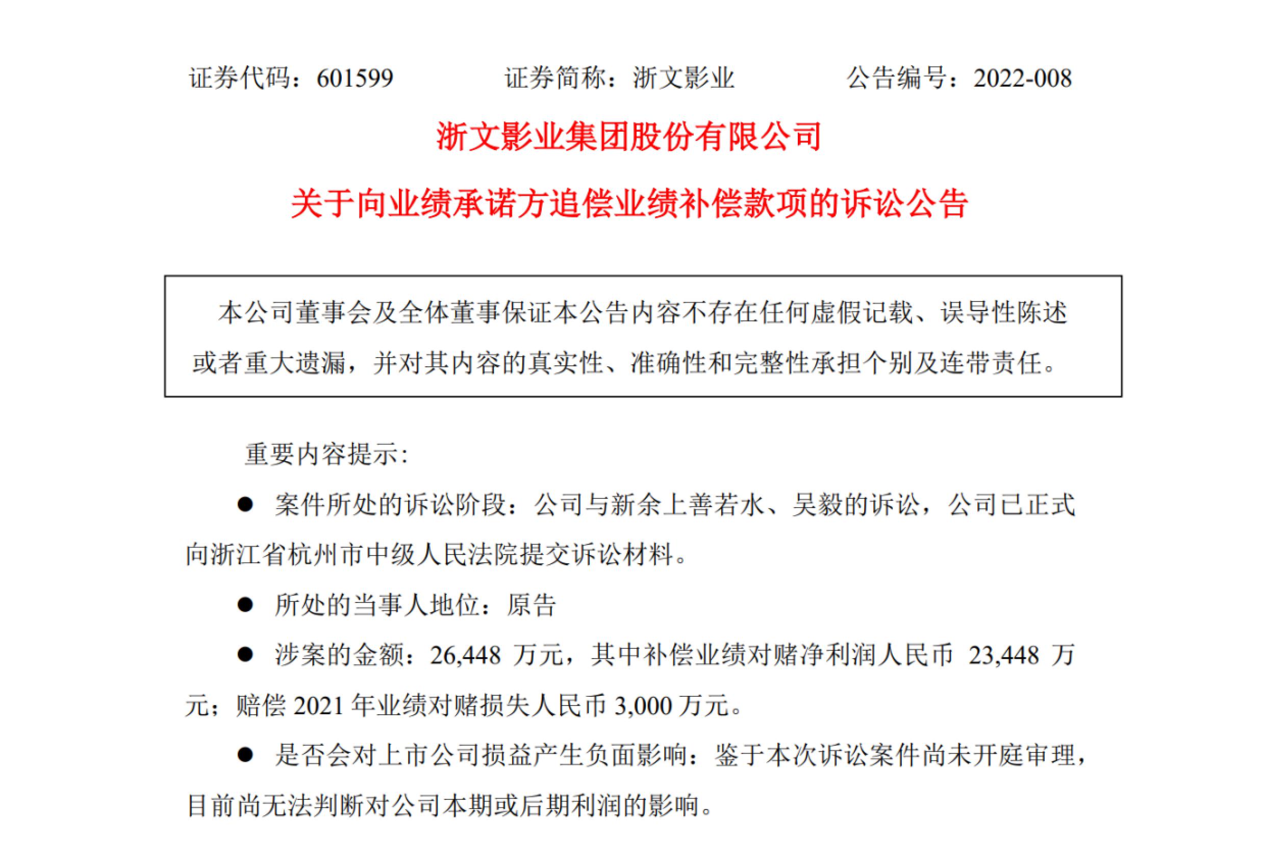 3月1日,浙文影业(601599.SH)发布公告称,截至2021年3月1日,业绩补偿义务人新余上善若水资产管理有限公司(下称“新余上善若水”)、吴毅尚未配合该公司完成现金补偿义务。浙文影业就与新余上善若水、吴毅之间关于业绩承诺和利润补偿事项,已向浙江省杭州市中级人民法院提起诉讼。