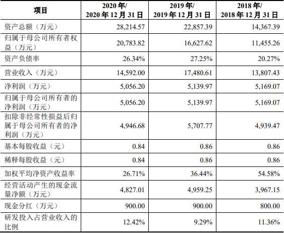 近年来,珠海鸿瑞的业绩持续下滑。2018年至2020年,珠海鸿瑞营业收入分别为1.38亿元、1.75亿元、1.46亿元,净利润分别为5169.07万元、5139.97万元、5056.20万元。