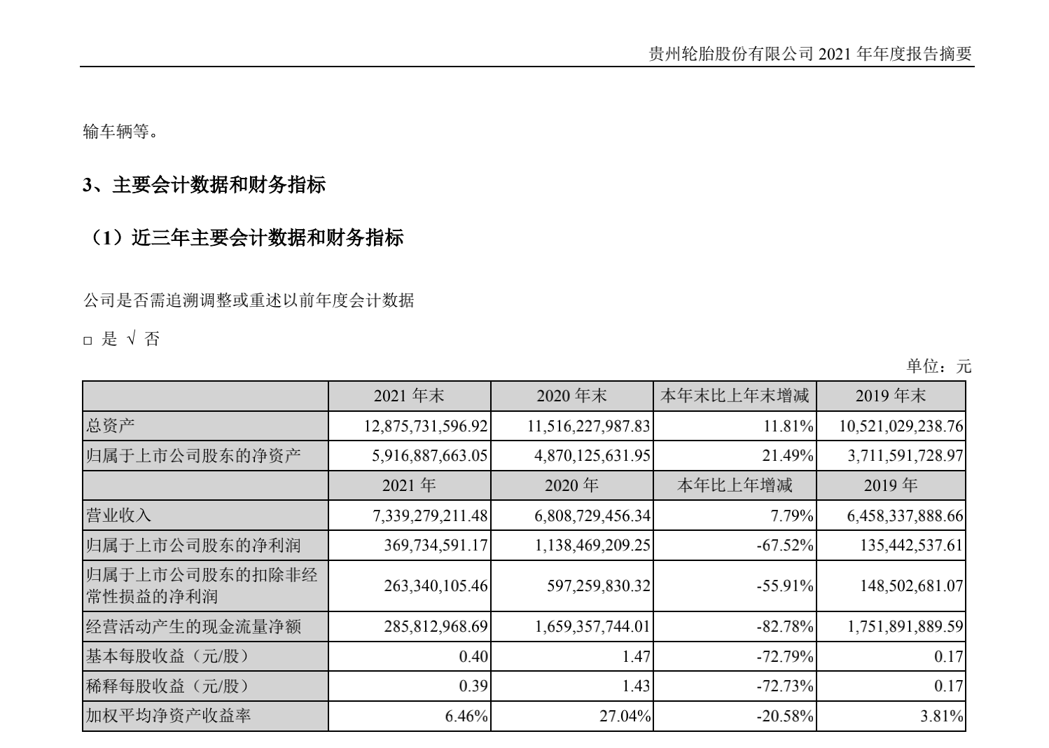 3月8日,贵州轮胎(000589.SZ)发布2021年年度报告摘要称,2021年实现营业收入73.39亿元,同比增7.79%;实现归属于上市公司的净利润为3.69亿元,同比下降67.52%。
