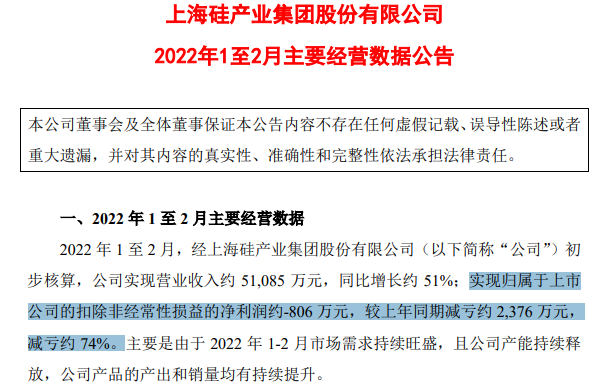 3月9日晚间,沪硅产业(688126.SH)首次发布月度经营公告称,2022年1-2月实现营收5.11亿元,同比增长51%;扣非净亏损为806万元,同比减亏74%。