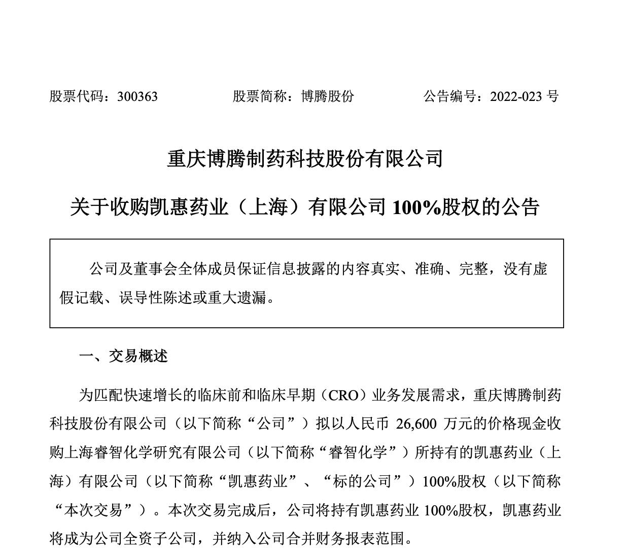 3月9日,博腾股份(300363.SZ)发布公告称,为匹配快速增长的临床前和临床早期(CRO)业务发展需求,该公司拟2.66亿元收购凯惠药业100%股权。本次交易完成后,该公司将持有凯惠药业100%股权,凯惠药业将成为博腾股份全资子公司,并纳入该公司合并财务报表范围。