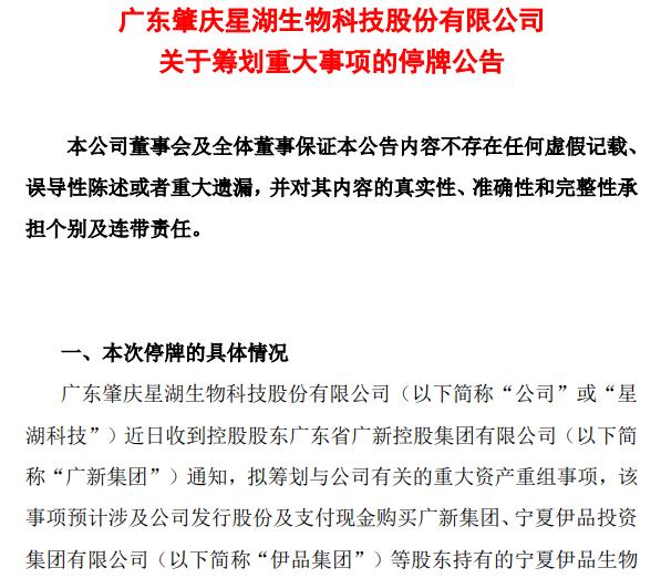 3月7日晚间,星湖科技(600866.SH)发布公告称,控股股东广新控股集团有限公司(下称“广新集团”)拟筹划发行股份及支付现金购买广新集团、宁夏伊品投资集团有限公司(下称“伊品集团”)等股东持有的宁夏伊品生物科技股份有限公司(下称“伊品生物”)全部或部分股权,并拟向符合条件的特定投资者发行股份募集配套资金。该交易方案尚待进一步商讨确定,该交易构成关联交易且构成重大资产重组,不会导致星湖科技实际控制人发生变更。