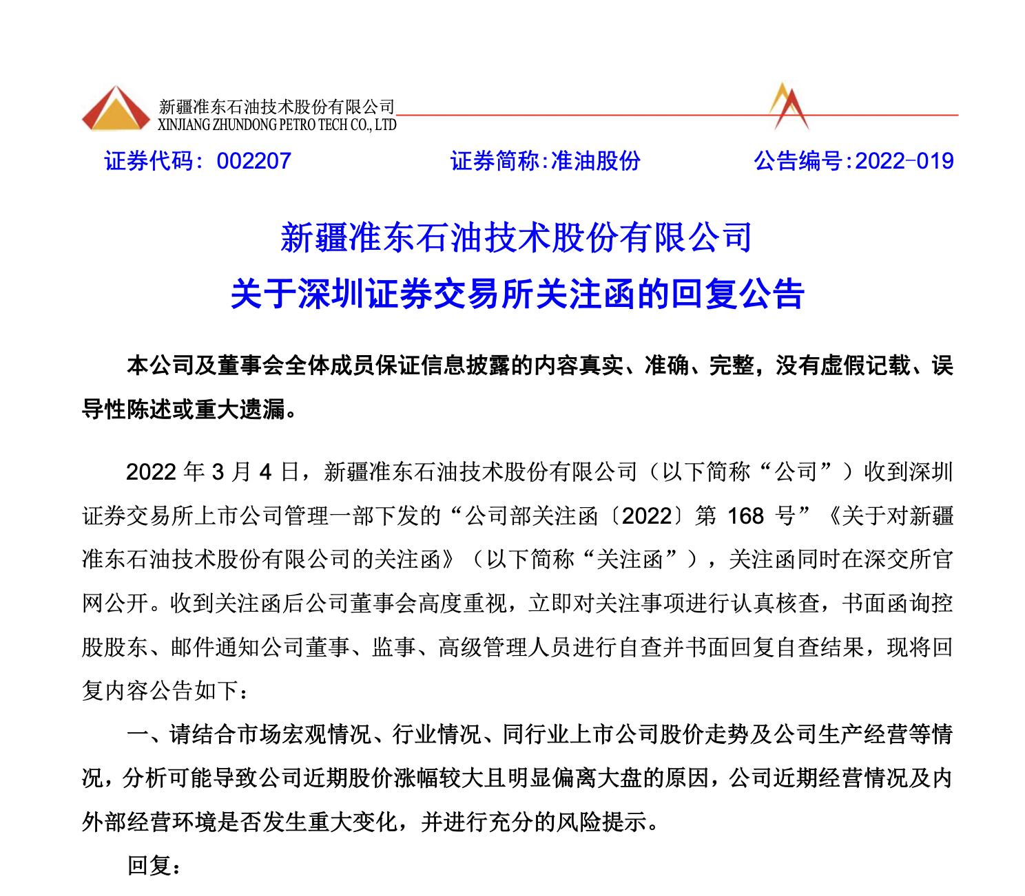 3月4日,准油股份收到深交所的关注函,被要求分析可能导致近期股价涨幅较大且明显偏离大盘的原因。