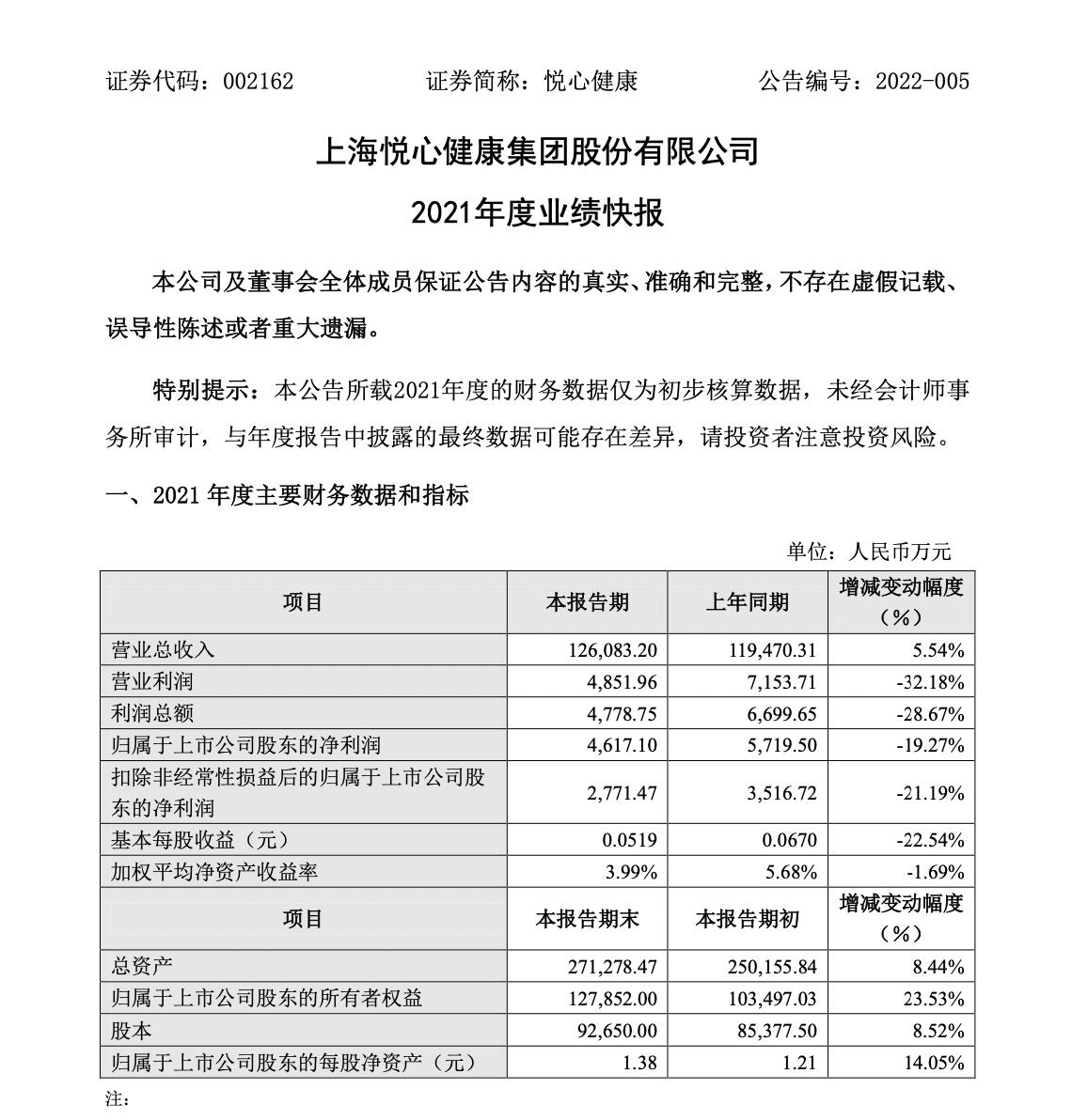 3月12日,悦心健康(002162.SZ)发布业绩快报称,2021年公司实现总营收12.61亿元,同比增长5.54%;归属于上市公司股东的净利润4617.10万元,同比下降19.27%。
