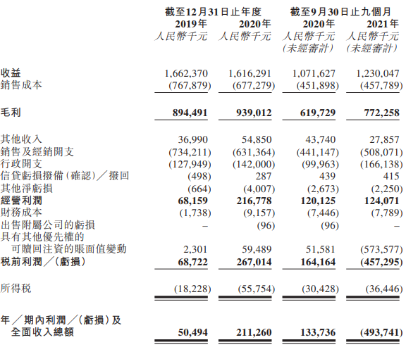 2021年前三季度,薇美姿出现亏损。2019年至2021年前三季度,薇美姿的收益分别为16.62亿元、16.16亿元、12.30亿元,期内利润分别为0.50亿元、2.11亿元、-4.94亿元。